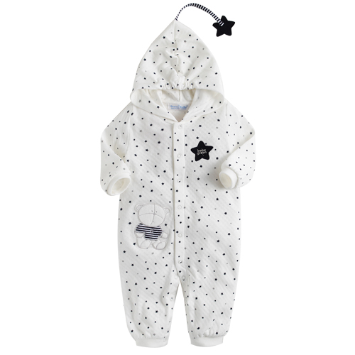 국내 생산 아기별 디자인의 따뜻한 우주복. 후드가 있어 보온성을 높임.