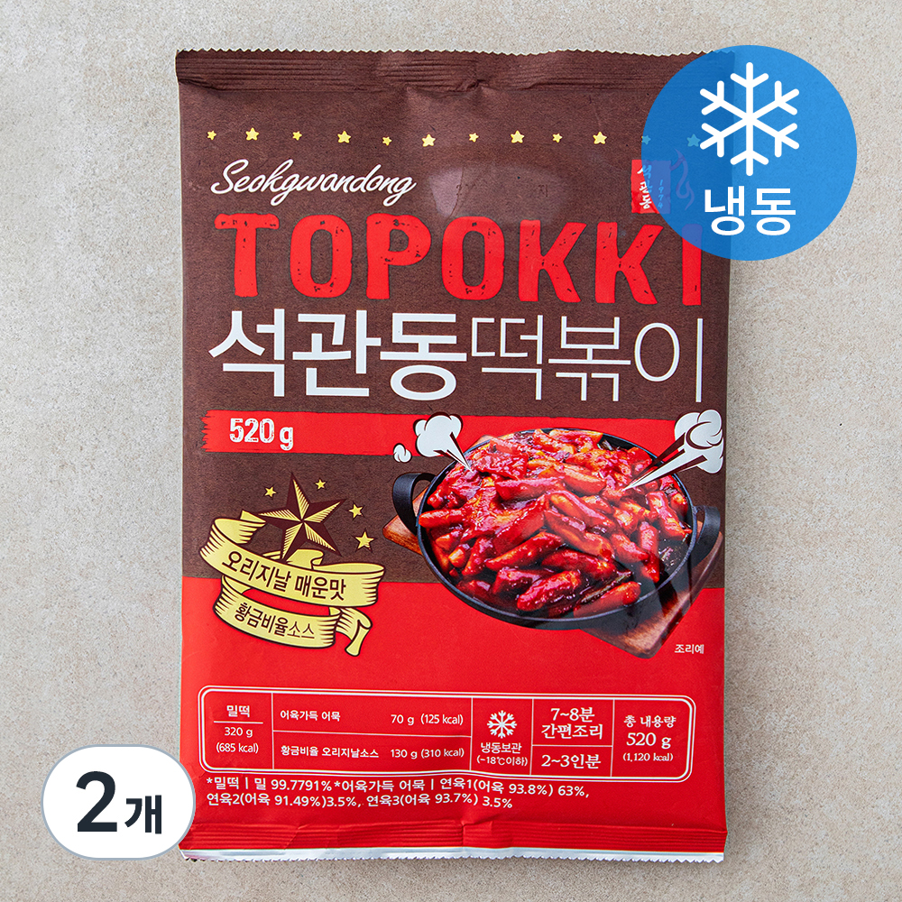 오리지널 맛의 냉동 떡볶이로, 520g씩 두 개 포장되어 있다. 매콤한 맛이 특징이다.