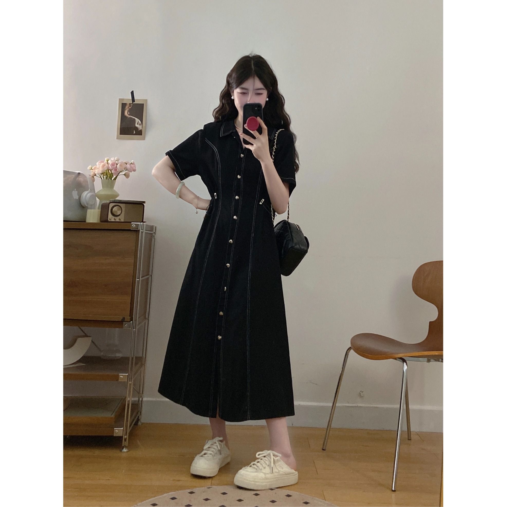 심플한 데님 셔츠 스타일의 롱 원피스로 데일리 착용에 적합합니다.