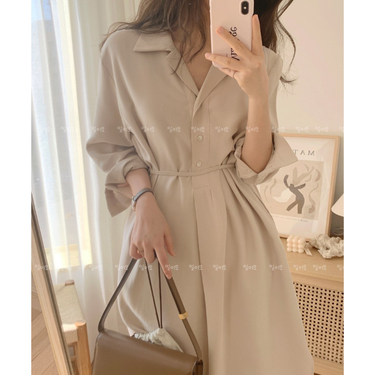 셔츠형 디자인의 롱 원피스로 허리끈으로 핏 조절이 가능합니다.