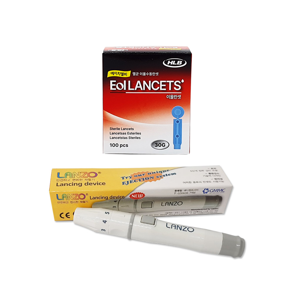 LANZO 란조 사혈기 + 에이치엘비 멸균 이올란셋 30G 100개입 체했을때손따기 채혈기 사혈침 채혈침 당뇨침