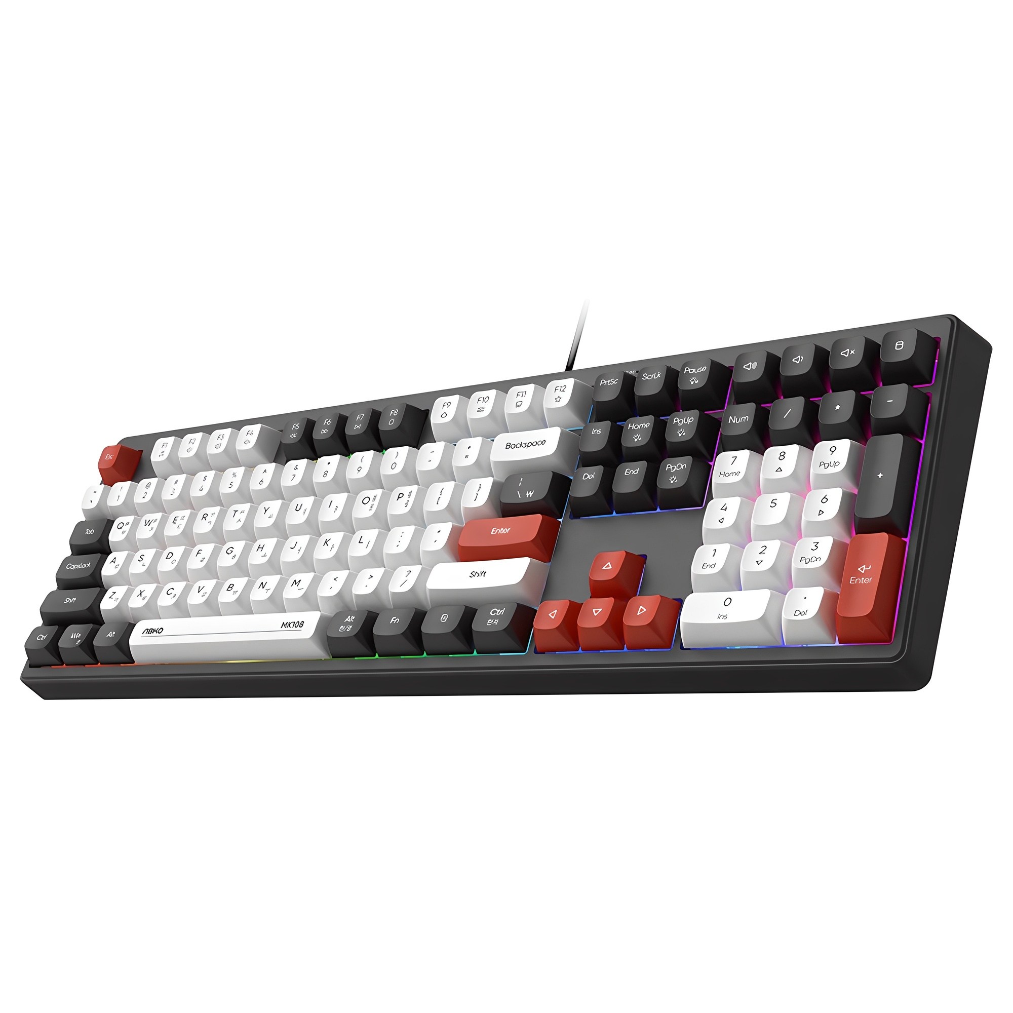 청축 키감의 저소음 풀배열 108키 멤브레인 키보드로 스타일리시하다.